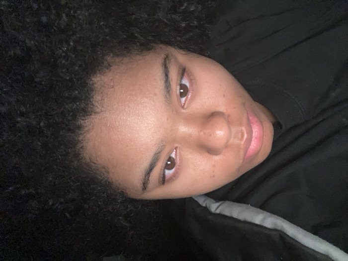 A person with curly black hair lays down, facing the camera. Their skin is a light brown tone. Their brown eyes are wide open and looking up. The nose is centered and round. Pink lips are closed. The person wears a dark-colored, possibly black, top with what appears to be a grey or white stripe along the collar or shoulder area. The background is dark, adding to the focus on the person's face.