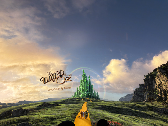 A vibrant image showcases the Emerald City from "The Wizard of Oz," with Dorothy and her companions walking along the Yellow Brick Road. Lush green hills frame the path leading to the sparkling green towers, all set against a backdrop of a blue sky filled with clouds. The "Wizard of Oz at Sphere" logo is prominently displayed, hinting at a promotional tie-in. The composition includes elements of nature with a rugged terrain on the right and the road cutting through the gentle hills to the left.