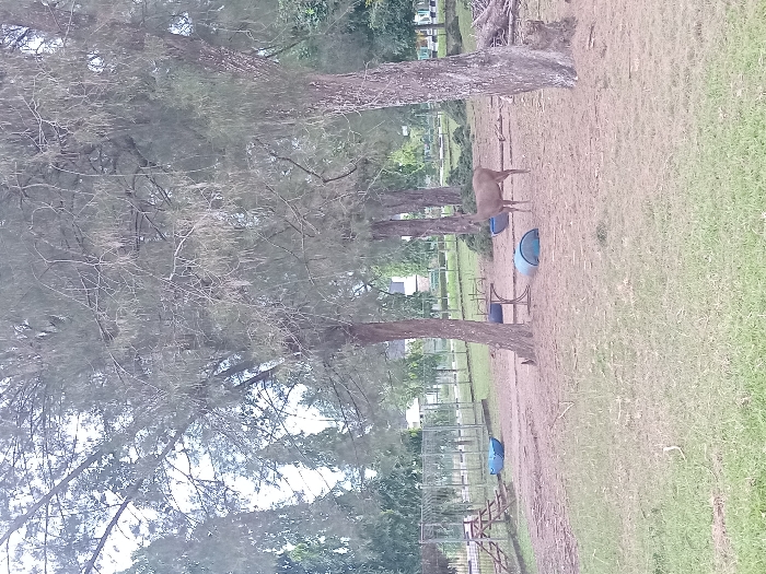This image depicts an outdoor scene in Palohgadeng, Indonesia, showcasing a park-like environment or animal enclosure. The foreground consists of sparse green grass transitioning to dry, light brown earth in the midground and background. Dominating the scene are several tall, slender trees with reddish-brown bark and dense, grey-green needle-like foliage, consistent with Casuarina species, providing shade. In the mid-right, a light brown deer stands facing slightly left, positioned on the dry earth. No antlers are visible. Scattered across the ground are three blue, plastic half-barrels or troughs; two are upright, and one is inverted. A small, light-colored metal stand is situated under one of the central trees. In the far left background, a low wooden structure resembling stairs is visible adjacent to a wire-mesh fence. This fence extends across the background, delineating an area. Beyond the fence, additional trees and the upper portions of white buildings with dark roofs are partially obscured by foliage. Organic debris, possibly fallen branches, is present on the ground in the mid-right background. The sky is overcast and light gray. No human subjects are present, and no discernible actions or interactions are occurring beyond the deer standing passively within its environment.