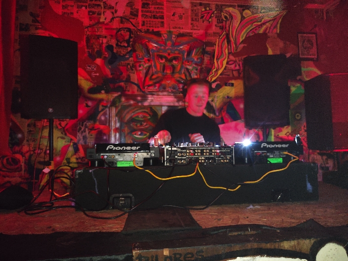 A DJ is performing at a club or event. He is standing behind a Pioneer DJ setup with turntables and a mixer. Bright spotlights illuminate the equipment. Speakers flank the DJ on both sides. The backdrop is a vibrant, chaotic collage of posters, graffiti, and artwork, giving the space a raw, underground vibe. The lighting is predominantly red, adding to the ambiance of a lively, energetic atmosphere.