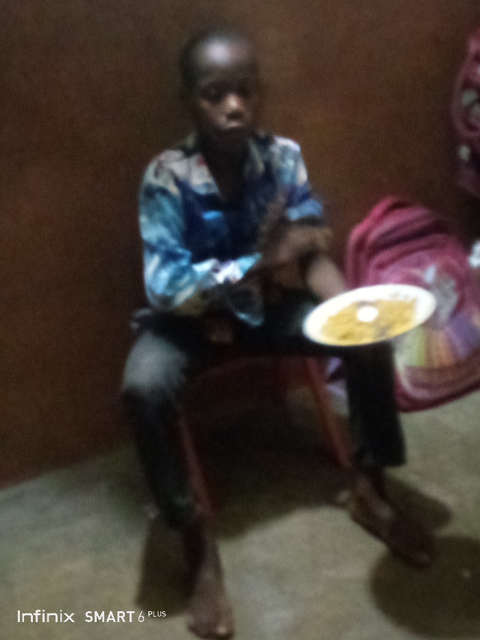 A young boy sits on a red plastic chair indoors, appearing to eat from a white plate. He wears a patterned blue and white shirt and dark pants. A backpack is visible in the background, and the lighting is dim. The room has plain walls and a simple setting. The camera used appears to be an Infinix Smart 6 Plus.