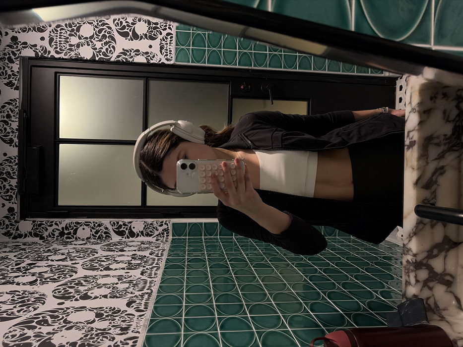 A forensic description of the scene depicts a young individual reflected in a mirror, taking a selfie inside a restroom. The subject, appearing to be a female, wears light-colored over-ear headphones, a white crop top, and an unzipped black athletic jacket. She holds a light-colored iPhone with a distinctive clear case featuring pink circular buttons to capture the image. Her midsection is visible, as are dark pants or leggings. The restroom features a marble countertop with prominent dark veining, on which a dark red insulated water bottle and a dark grey rectangular object are placed. A black faucet component is partially visible. The lower walls are clad in dark green circular-patterned ceramic tiles, while the upper walls are covered with white wallpaper displaying a repeating pattern of black intricate skulls and floral/scrollwork. Behind the subject, a black-framed door with frosted glass panels is visible. A portion of the mirror's black frame is discernible on the right side. Based on the unique combination of the green circular tiles and the skull-patterned wallpaper, this location is identifiable as a restroom within **Higher Ground** (formerly Handlebar Rooftop), located in Austin, Texas, United States of America.