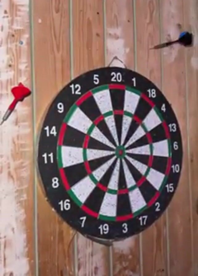 dartboard mounted on a wooden wall. Four darts are thrown at the dartboard. One dart lands in the "18" section, one lands near the "14" section, one lands near the "5" section, and one dart falls on the floor.
