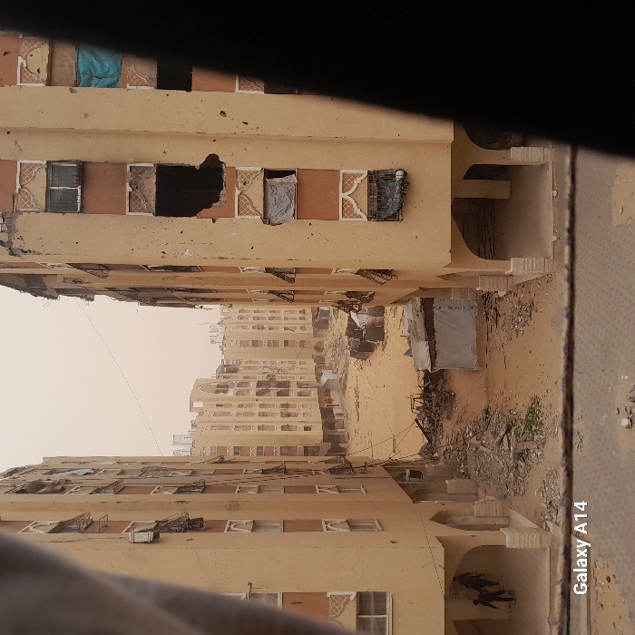 The image depicts a devastated urban residential area in Khan Yunis, Palestinian Territory, viewed from an elevated position, possibly a window or balcony, showing parts of a framing structure in the foreground. Two multi-story apartment buildings, constructed with light beige or tan facades and brown window trim, frame a central expanse of disturbed ground. Both buildings exhibit extensive damage: multiple windows are blown out, some show missing glass, bent frames, or are covered with makeshift tarps (blue, grey, dark fabric). The right building has a large, irregular black hole on a mid-level floor. Concrete debris and structural damage are visible along the upper edges of both buildings. The ground between the buildings is primarily sand and dirt, heavily strewn with rubble, shattered concrete, and twisted metal debris. Electrical wires or cables crisscross the space, some appearing damaged or dislodged. In the mid-ground, a small, makeshift shelter or structure, possibly covered with a light-colored tarp, stands amidst piles of larger debris. Further back, additional damaged apartment buildings are visible. Three small figures, appearing to be people in dark clothing, are walking away from the viewer under an arched entryway at the base of the left foreground building. The sky is a hazy, light brown-grey, indicating dusty or overcast conditions. A "Galaxy A14" watermark is visible in the lower left corner.