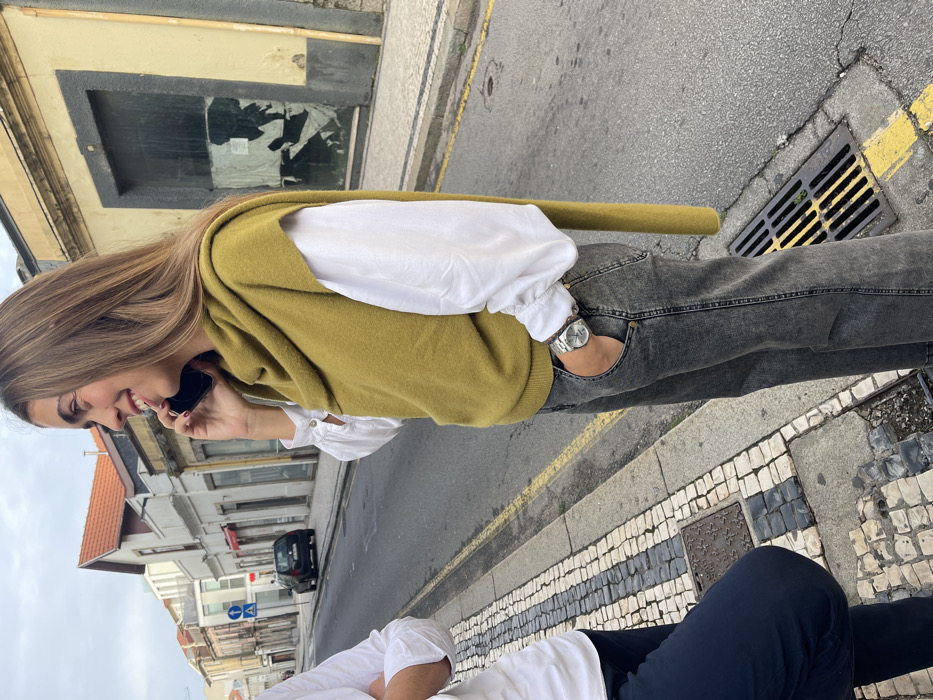 An outdoor, eye-level photograph captures two individuals on a city street in Aldoar, Foz do Douro e Nevogilde, Portugal. The primary subject, a young adult female with long brown hair, is positioned on the right, facing left in a three-quarter profile, smiling broadly. She is speaking on a dark smartphone held to her right ear. Her attire consists of a white long-sleeved collared shirt, an olive green cowl-neck sleeveless top or wrap, and dark grey acid-wash jeans. A silver-toned wrist watch and a multi-strand bracelet are visible on her left wrist, with her left hand placed inside her left jean pocket. To the left, partially visible, is the torso and legs of a second individual, wearing a white long-sleeved shirt with arms crossed and dark blue trousers. The immediate environment features a black and white patterned cobblestone sidewalk on the left and a grey concrete curb bordering an asphalt road. A yellow painted line runs along the right curb, above a rectangular metal drain grate. In the background, a row of multi-story buildings with varied facades (including yellow and white paint, and a weathered dark door) lines the street. A dark compact car is parked further down the street on the left, near a blue circular traffic sign. The sky above is overcast.