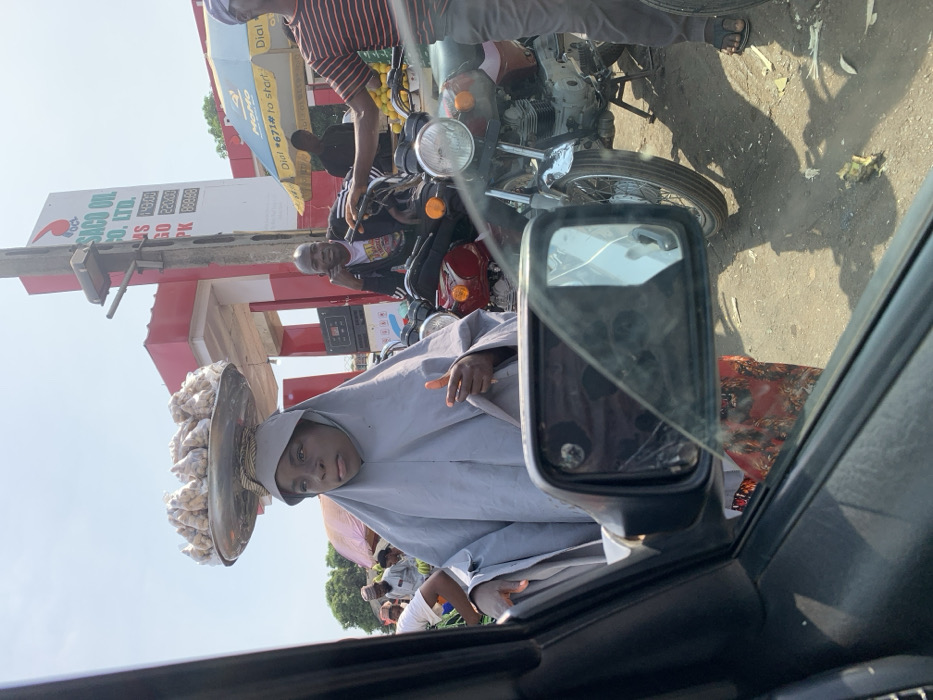 A woman wearing a light gray garment and carrying a large round tray of white items on her head stands outside a car window. A rearview mirror is prominently visible. In the background are a gas station with a sign displaying prices, a man on a motorcycle, and other pedestrians. The scene depicts a busy street environment, possibly in an African country.
