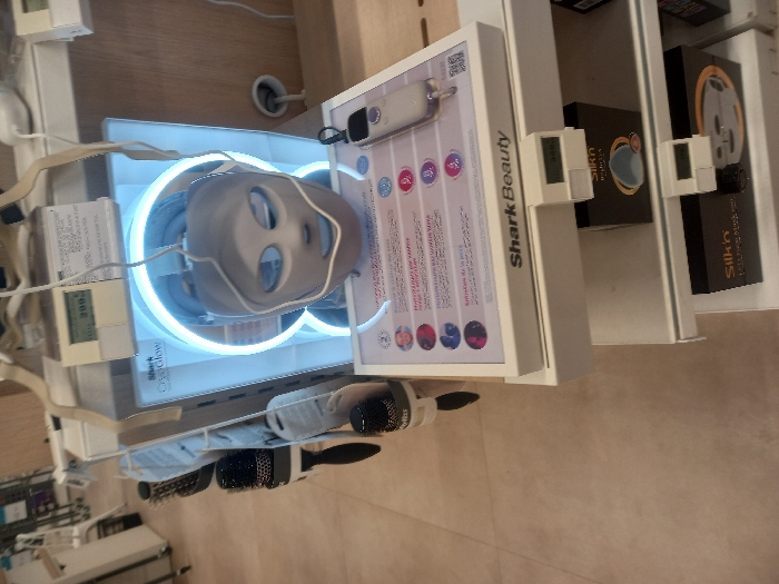 A display features a gray mask connected to a blue-lit device. Below the device are styling brushes. To the right are "Shark Beauty" and "Silk'n" products on shelving. The background is light, possibly beige or light brown. The arrangement suggests a retail setting promoting skincare and beauty products.