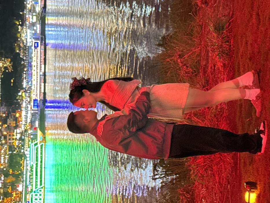 - "At night in 江北城街道, China, a couple stands closely embracing on a grassy bank next to a large body of water" by FM-LQg7b2, licensed under CC BY 4.0