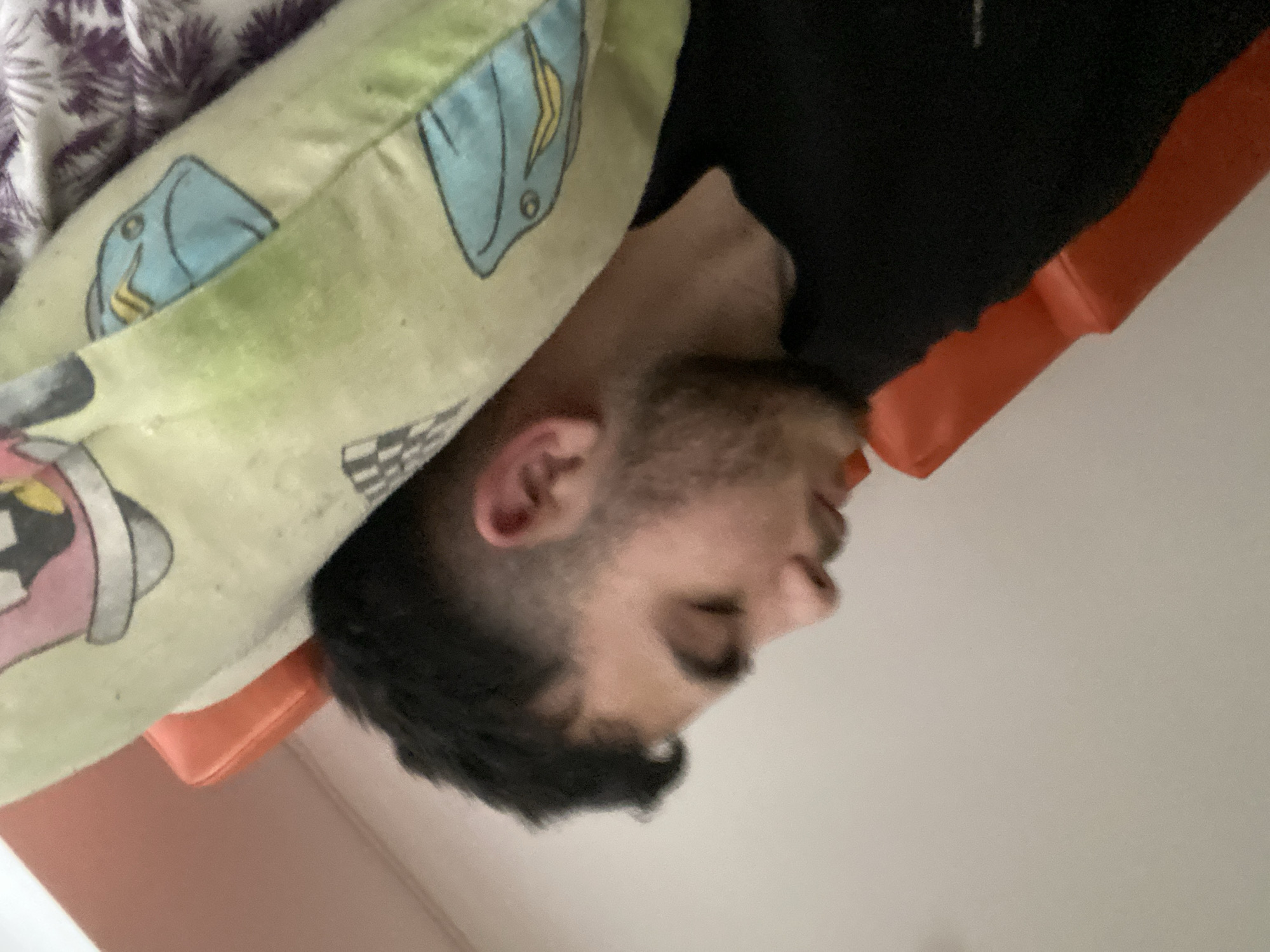 A man lies in bed, partly under a pillow with cartoon images. He has short, dark hair and a beard. He is wearing a black shirt. An orange object is visible near his head. The location is likely indoors, but no details suggest it is in Sofia, Bulgaria.