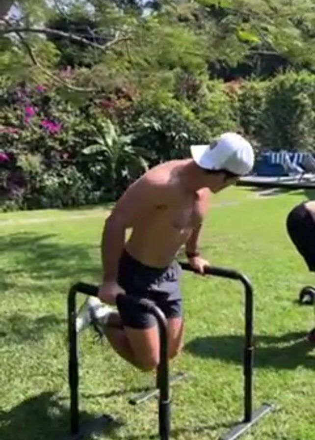 shirtless man doing triceps dips on parallel bars on a lawn in a backyard. He is wearing a white baseball cap, black shorts, and white sneakers. Another shirtless man is standing behind him. The backyard is well-manicured with green grass, trees, and flowers. In the background, there are blue pool chairs.