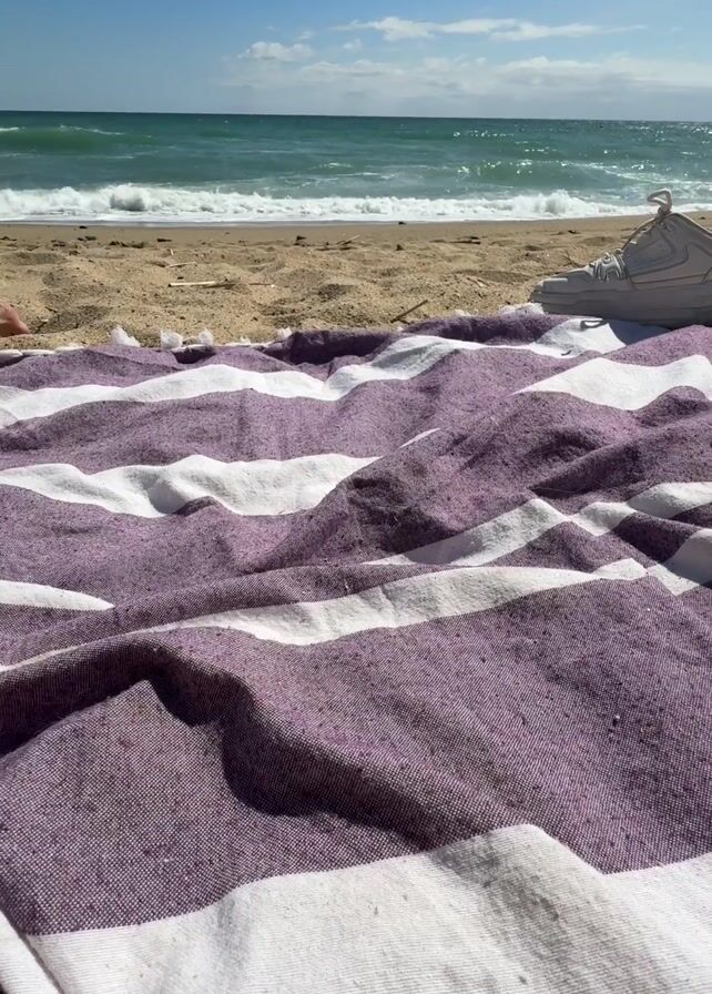 beach scene, with a purple and white striped beach towel in the foreground, slightly rumpled, obscuring the lower portion of the frame