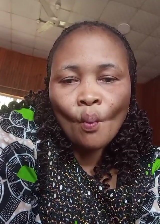 A woman is centered in the frame, looking directly at the camera. Her skin appears tan. She has dark hair styled in small twists that frame her face. She is wearing a patterned shirt with a black base, white and brown abstract shapes, small black beads sewn around the neckline and chest area, and green accents on the shoulders. She repeatedly purses and moves her lips in different directions, as if exercising the muscles. Behind her, the wall is wood-paneled. Above her head, a white ceiling fan is visible. Light streams in through a window on the left side of the frame.