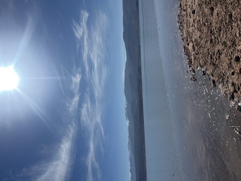 This image presents a wide outdoor scene at the Bin El Ouidane Lake in Bin El Ouidane, Morocco. The upper portion of the frame is dominated by a clear, bright blue sky with sparse, elongated white cirrus clouds. The sun is prominently visible in the upper right quadrant, emitting a strong lens flare. Below the sky, a distant mountain range stretches across the horizon, with several peaks on the left side showing white snow caps. The midground features a large body of calm, light blue-grey water, which occupies a significant portion of the image and reflects the sky's brightness. The immediate foreground on the right consists of a reddish-brown, rocky, and earthen shoreline. The water meets this shore, showing small ripples and reflections of light. No individuals, animals, vehicles, or specific objects are identifiable within the scene.