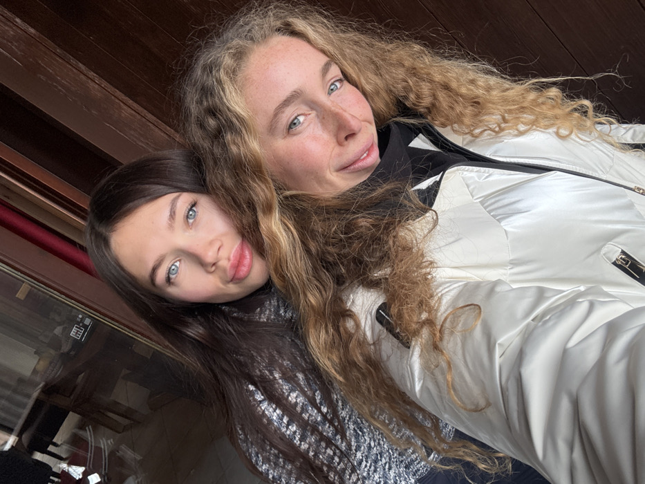 Two women pose closely together. One, with long dark brown hair and blue eyes, purses her lips towards the camera. The other, with curly blonde hair, wears a white puffer jacket with visible zipper detailing. The background includes wooden panels and reflections visible in a window. Both women appear fair-skinned and have similar eye color.