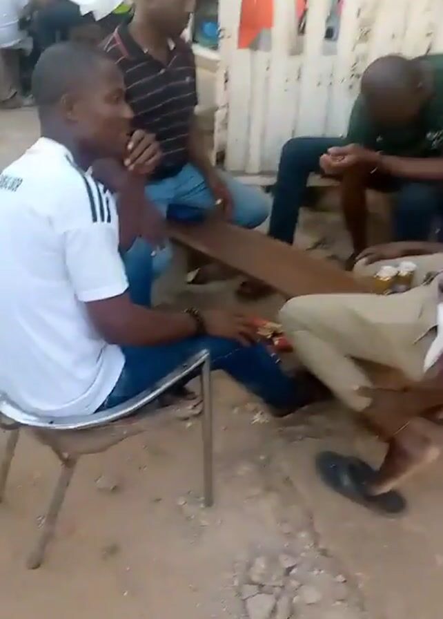 group of men sitting outside a shop. They are sitting on chairs and a wooden plank, and appear to be talking and laughing. Some of them are holding cans. The shop has posters advertising drinks on its wall. The ground is sandy. A cell phone's timestamp is visible at the bottom.