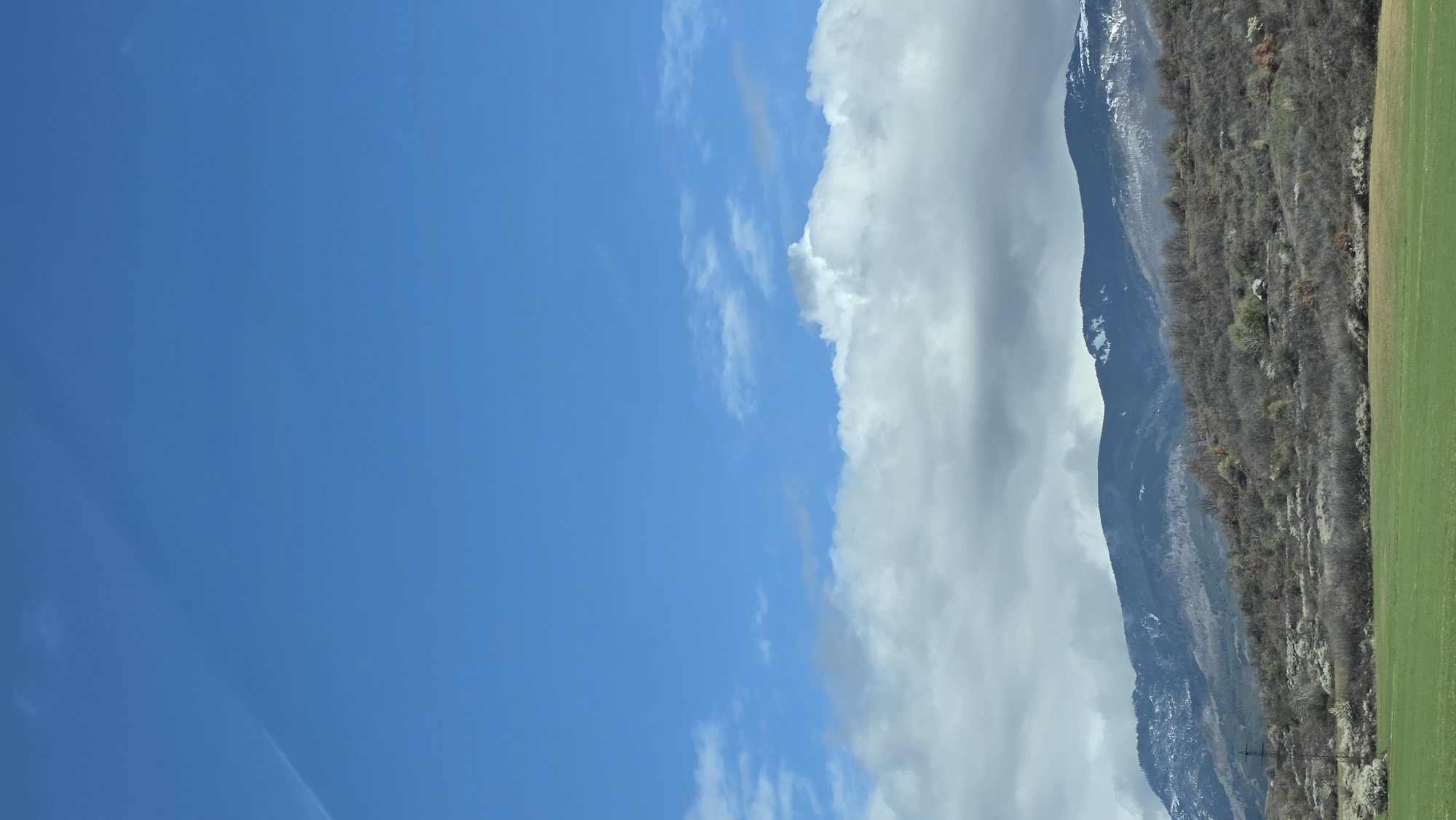 landscape under a bright blue sky with scattered cirrus clouds. A large, thick band of cumulus clouds partially obscures the sky towards the middle of the frame. A mountain range is visible, its slopes covered in sparse vegetation and rocky outcroppings, with some snow visible at higher elevations. A green field is present in the lower right corner. The image is oriented vertically. It is not possible to verify the location in the city of Usoika, Bulgaria with the provided information.