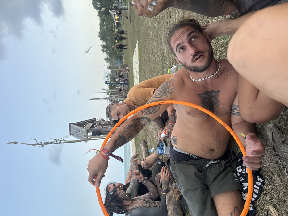 The scene depicts an outdoor gathering in Ban Pang Pring, Thailand, set on a grassy area adjacent to a beach under a light blue, cloudy sky. In the immediate foreground, a shirtless man with a beard, dark hair pulled back, and a shell necklace lies on his right side on the grass, looking upward towards the viewer. He wears dark green shorts over black underwear and displays extensive tattoos, including a large wolf design on his chest/abdomen and tribal patterns on his arms. He holds an orange hula hoop with his left hand, which also contains a small yellow object. An arm belonging to another individual, heavily tattooed and adorned with multiple rings and wristbands, also grasps the hula hoop on the left. In the midground, several individuals are visible lounging or seated on the grass. One man with short, styled hair and an orange-brown short-sleeved shirt is seated, leaning back, also with tattooed arms. To his left, another man with dreadlocks and extensive dark tattoos is seated, holding a lit cigarette. A plastic water bottle and a white tube are placed on the grass near these individuals. The sandy beach and ocean are visible behind them. The background features various rustic, artistic wooden structures scattered across the landscape. These include a tall, bare wooden pole strung with lights and a larger, hut-like wooden structure with a peaked roof. Further back, more people are present, standing and sitting. Palm trees line the distant horizon, and a white kite or similar object is visible high in the sky to the right. The overall environment suggests a casual, festive outdoor event by the sea.