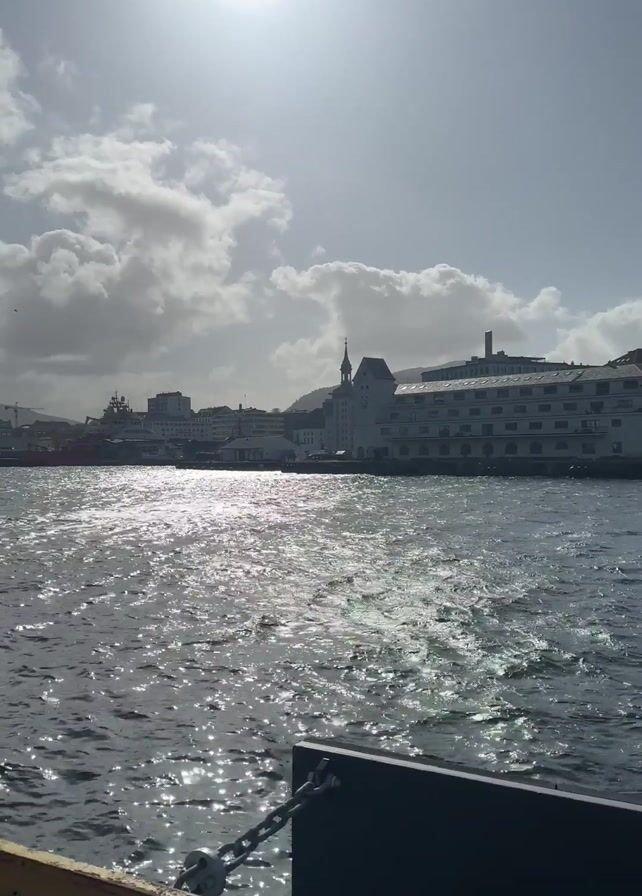 harbor scene in Bergen, Norway, on a sunny day. The sun is high in the sky, partially obscured by clouds, which reflect on the water creating a sparkling effect. The camera is positioned on a pier, as indicated by the edge of the pier visible in the foreground. A large white building with a clock tower is located in the midground on the right side of the frame, and several other buildings can be seen further down the waterfront. In the background, the scene is framed by hills. In the far left, a large ship is entering the harbor. The water is choppy.