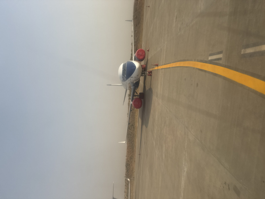 This image depicts a stationary medium-sized passenger aircraft on a concrete apron at an airfield in Gwaska, Nigeria. The aircraft features a white fuselage with a prominent blue livery on its nose cone and cockpit section. Both engines are fitted with bright red protective covers. The aircraft's landing gear is deployed. On the concrete tarmac in the foreground, a distinct yellow curved line, indicative of a taxiway or parking guide, leads towards the aircraft's nose gear. Two orange conical markers are positioned on the tarmac near this yellow line, in front of the aircraft. The environment beyond the tarmac consists of dry, light brown vegetation and terrain under a pale, hazy sky, suggesting dusty or arid conditions. Partial views of other aircraft components are visible; a white wing and tail fin are present on the far left, and another distant tail fin is partially visible on the far right horizon. No individuals, explicit actions, or interactions are discernible within the frame.