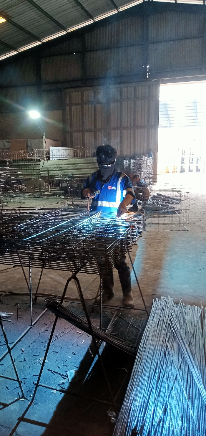 Inside a metal building, a person welds a metal grid supported by sawhorses. Sparks and smoke rise from the welding point. The welder wears safety glasses, a face covering, a blue work shirt, and boots. Bundles of metal rods are on the floor near the welder. Other assembled grids and another worker are visible in the background, illuminated by a work light and daylight through a large doorway.