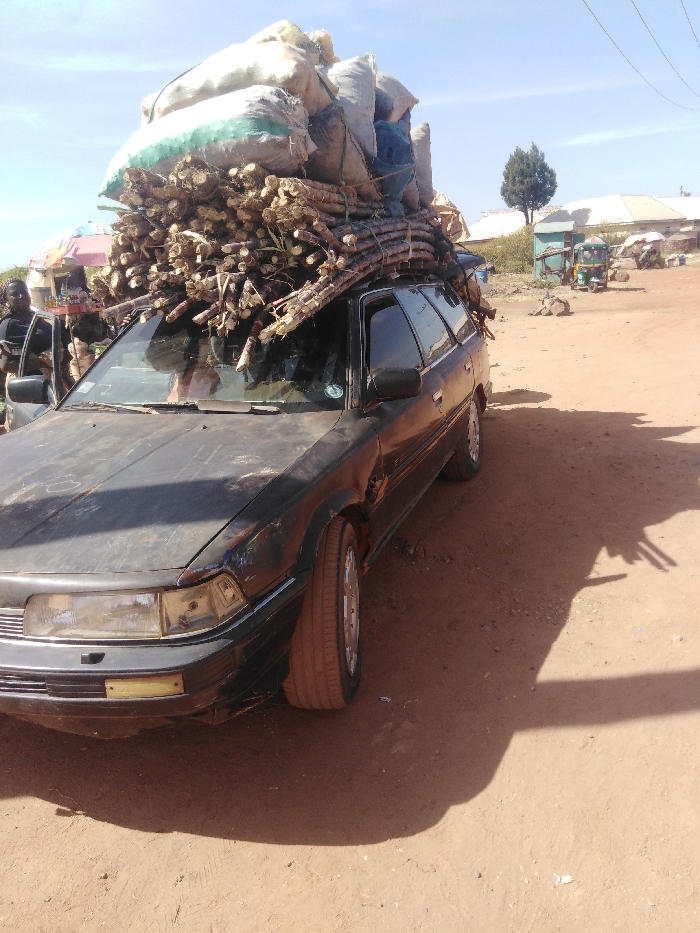 A black, heavily laden station wagon is stationary on an unpaved, reddish-brown dirt road under a clear blue sky in Jos, Nigeria. The vehicle, an older model with visible wear and rust, carries a substantial load on its roof. The primary cargo consists of numerous bundles of harvested sugarcane stalks, meticulously stacked horizontally across the roof rack. Above the sugarcane, several large, light-colored sacks, possibly containing agricultural goods, are secured. The car's front right headlight assembly is visibly damaged, missing its outer lens. To the immediate left of the vehicle, a dark-skinned individual is partially visible through the open rear driver's side door. Further left, a vendor's stall with a red and white striped umbrella is present. In the background, single-story structures with light-colored walls and roofs are visible, along with a solitary green tree. A green and yellow Keke Napep (motorized tricycle) is parked further down the dirt road on the right, near additional market-like structures. Harsh sunlight casts prominent shadows on the dirt ground to the right of the car. No direct interactions between individuals are discernible.