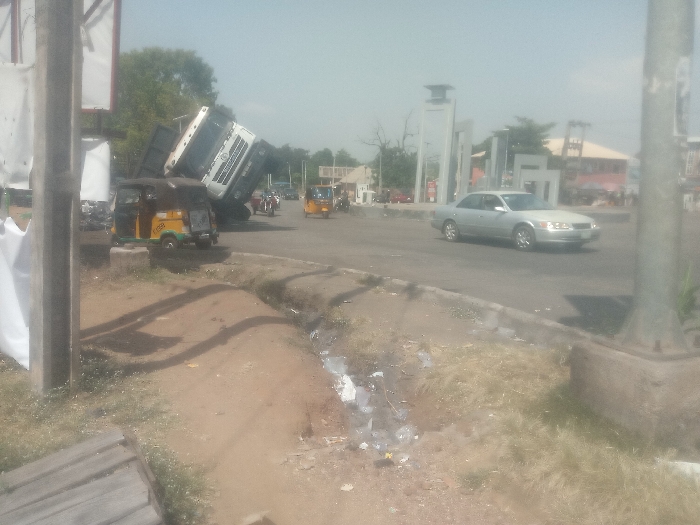 A tipped-over truck rests precariously on the back of a yellow auto-rickshaw, in what appears to be a street-level accident. Other auto-rickshaws and motorcycles are nearby. A light-colored sedan drives past on the road. A ditch with trash sits in the foreground. Distant buildings and trees make up the background, along with an architectural structure with multiple vertical supports.