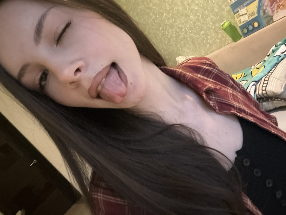 An indoor, close-up photograph depicts a young female individual, angled slightly diagonally from the upper chest upward, with her head tilted. Her dark brown hair is long, parted, and flows over her left shoulder. She has a pale complexion, with her right eye open and looking towards the camera, while her left eye is closed in a wink. Her mouth is open, with her tongue extended outward. She is wearing a dark, possibly black, ribbed top with button detailing, partially covered by an open red and white plaid flannel shirt. The background on the left side shows a dark brown, possibly wooden, door or furniture piece. The background on the right is a light green textured wall or wallpaper. In the lower right corner, a portion of colorful bedding or a blanket with cartoon-like patterns (including a yellow character) is visible on what appears to be a bed or sofa. A green plastic bottle or container stands upright next to the bedding. Adjacent to the bottle, a stack of papers or a magazine with visible Cyrillic text is present. The scene is located in a room within the city of Kudrovo, Russia.