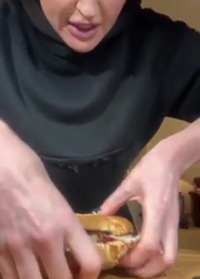A person wearing a black hoodie cuts a sandwich in half, revealing a cross-section of its ingredients. The ingredients appear to be bread, meat, and a red jam. The person then holds up the two halves of the sandwich to the camera, widening their eyes and opening their mouth. The person is standing in front of a wooden cutting board.