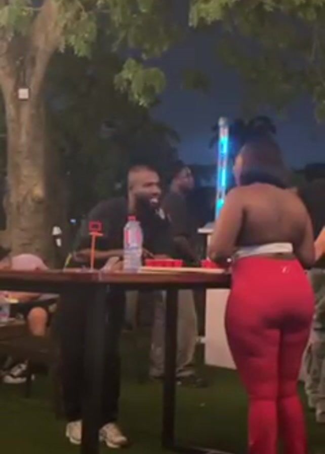 The video depicts a scene outdoors at dusk, potentially in a backyard or patio setting, where people are gathered around a table playing a game. A man wearing a dark-colored shirt and light-colored sneakers is standing at the table, apparently setting up or manipulating the game. Facing him is a woman with short black hair, wearing red pants and a white top that exposes her back. Other people are standing around in the background, and some are seated at a separate table. A large tree looms over the area, and there is soft, atmospheric lighting. The sound of music, possibly Caribbean in nature, can be heard in the background. The game on the table appears to involve small cups or objects arranged in a pattern, and the man seems to be explaining the rules or giving instructions to the woman.