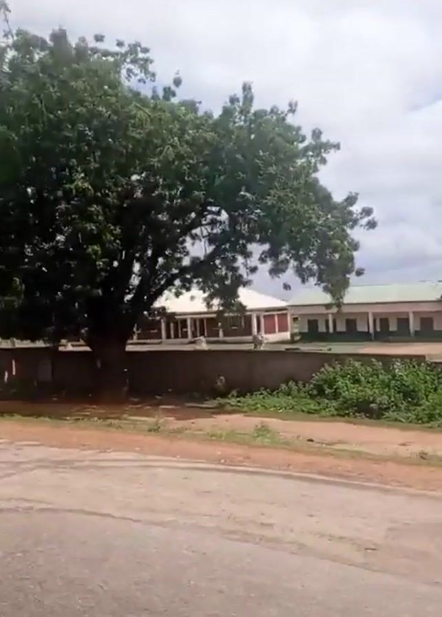 street scene on a cloudy day. A large tree is visible on the left. Buildings, possibly a school, are situated behind a low wall in the background. A silver Peugeot car and a yellow Bajaj RE tricycle drive down the road. The video is shot from a moving vehicle.