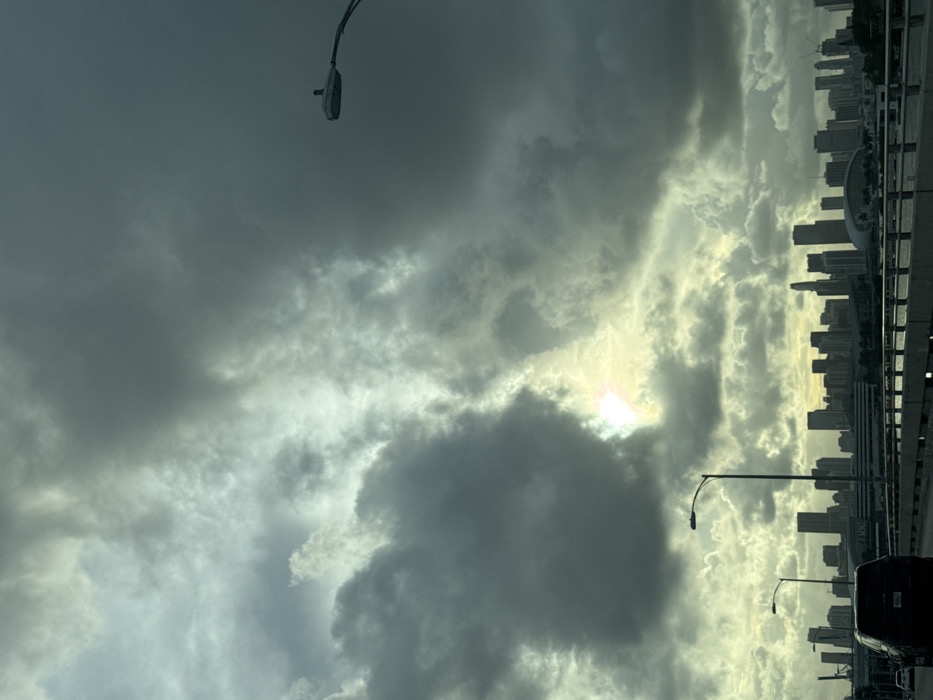 The image displays a panoramic view of the Downtown Miami skyline under an overcast sky, captured from a bridge consistent with a causeway originating from Miami Beach, United States, looking westward across Biscayne Bay. Thick, dark grey cumulus clouds dominate the upper two-thirds of the frame. A strong, localized beam of yellowish-white sunlight penetrates a narrow vertical gap in the clouds on the left side of the sky, creating a stark contrast. In the immediate foreground on the left, the rear-left quarter of a dark-colored SUV or similar vehicle is partially visible on the roadway. To the right of the vehicle and slightly further back, a grey streetlight pole with a horizontal arm and a single luminaire is prominently featured. Another similar streetlight is partially visible further to the left. A concrete bridge barrier with metal railings extends across the lower portion of the image, separating the viewer from the water below (mostly obscured). The distant skyline of Downtown Miami is visible, comprising numerous high-rise buildings and skyscrapers. A distinctive large, white dome-shaped building (the Kaseya Center) is discernible among the structures, positioned slightly to the right of the image's center. No people are visible.