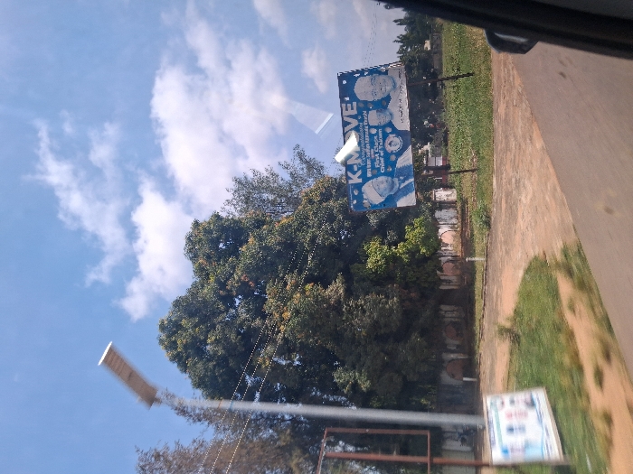 This daytime image, taken from a moving vehicle in Takum, Nigeria, displays an outdoor scene under a blue sky with scattered white clouds