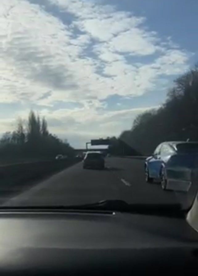 car driving on a highway on a partly cloudy day. Other cars are visible in the adjacent lanes. The highway is flanked by trees. A sign above the road is visible. The view is from inside a car.