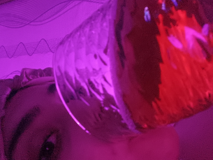 A close-up image depicts a person holding a transparent glass containing a reddish-orange liquid, likely a beverage, under strong purple lighting. Only the upper left portion of the person's face is visible, including a dark left eye and part of an eyebrow. The head appears partially covered by a light-colored, possibly fabric, item. The glass, which occupies the lower right section of the frame, is held close to the face, obscuring the lower facial features. A thin layer of foam or bubbles is visible at the surface of the liquid. The background features a wall or surface with a repeating wavy or zigzag pattern, all illuminated by the dominant purple light. The scene is situated indoors in Gorna Oryahovitsa, Bulgaria.