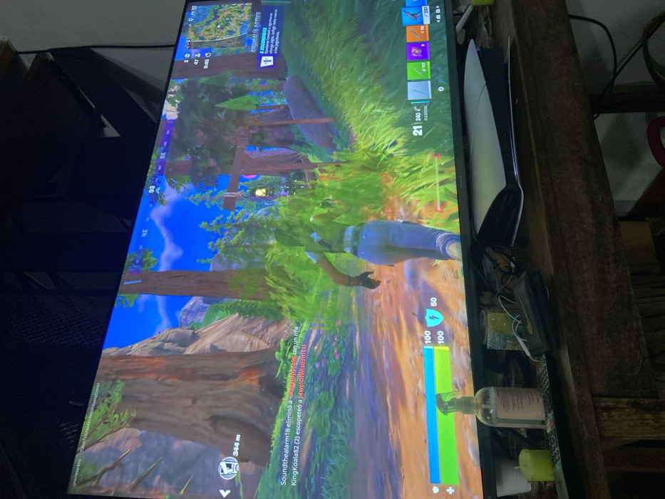 The image depicts a close-up indoor scene, likely in a residence in San Antonio de Padua, Argentina, focused on a television displaying a video game. A large, dark-framed flat-screen television dominates the upper half of the frame, showing gameplay from what appears to be Fortnite. The game screen displays a female character with brown hair, wearing a dark vest and light blue jeans, running on a dirt path through a lush, forested environment with large trees, green foliage, and distant rock formations under a bright blue sky. User interface elements visible include health and shield bars (100/100 and 50 shield respectively), a kill feed in Spanish indicating "Soundthealarm18 eliminó a crazykachori con un rifle" and "KingKoala82 (2) escopeteó a JewelOfWisdom (1)", a mini-map, a compass pointing NE (93 degrees), and weapon slots at the bottom right showing various items and ammunition counts (e.g., shotgun with 240 ammo, assault rifle with 187 ammo). An "ANOMALÍA ACTIVA" (Active Anomaly) notification in Spanish is also visible on the right. Below the television, on a rustic dark wooden table, are several items. To the right, a white and black PlayStation 5 console is positioned horizontally. To the left, a clear plastic bottle of hand sanitizer with a white pump is visible, next to a small green cylindrical candle. A black TV remote control and a dark wallet or pouch with white earbuds or cables resting on it are situated between the hand sanitizer and the console. The area directly above the television shows a dark, textured ceiling or wall structure.