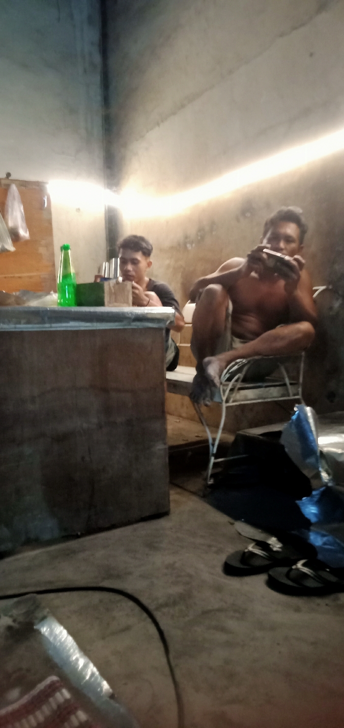 This image captures an indoor scene in Sumput, Indonesia, featuring two adult males in a dimly lit, utilitarian space