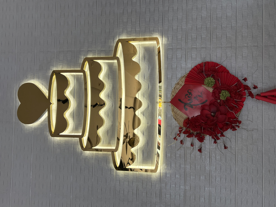 The image displays a static indoor scene featuring two decorative objects mounted on a light grey, textured wall resembling whitewashed brickwork. The upper object is a three-tiered, cake-shaped decoration crafted from reflective gold-colored material, crowned with a matching heart-shaped topper. It is backlit with warm white LEDs, creating a halo effect, and shows reflections of the surrounding environment, including a potential light fixture on its lower tier. Directly below this and centrally aligned, a circular woven bamboo ornament, approximately half the width of the cake decoration, is suspended. This ornament is festively adorned with an arrangement of various red artificial flowers, red folded paper fan shapes, and green pom-pom-like elements. A central red rectangular paper, featuring black Vietnamese calligraphy (likely "Xuân" for Spring and other Tết well-wishes), is prominent. Two red fabric tassels hang from the bottom of the woven ornament. The decorations suggest a celebratory theme, characteristic of Lunar New Year (Tết) celebrations in Ho Chi Minh City, Vietnam. No individuals or active subjects are present in the scene.