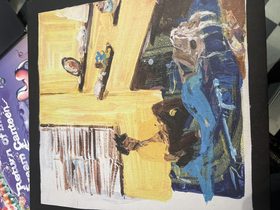 An oil painting on canvas depicts a distorted, abstract scene
