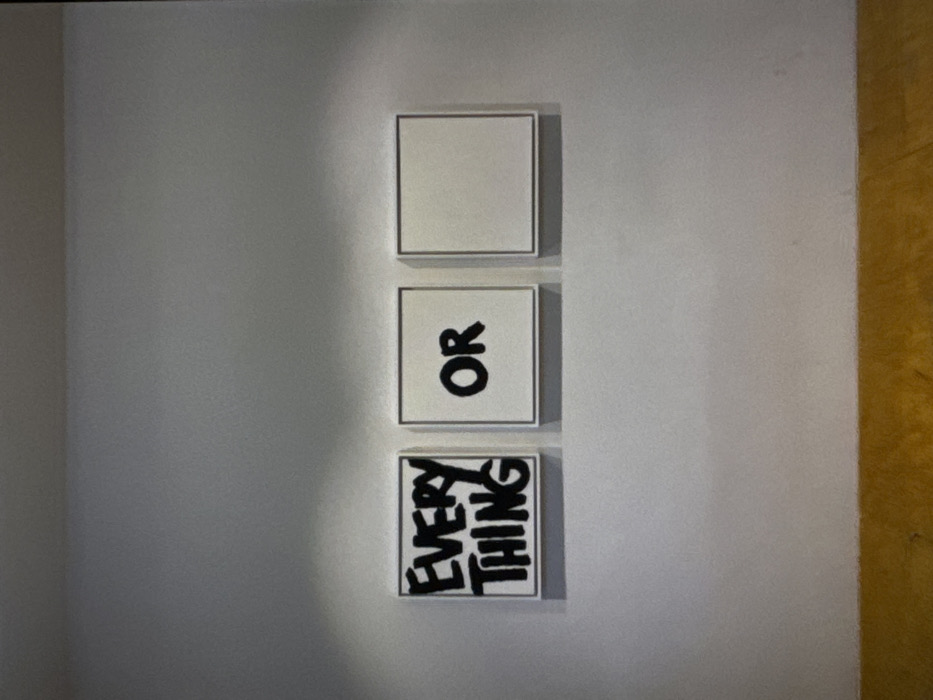 Three square white artworks hang vertically on a light gray wall. The top one is blank. The middle one displays "OR" in thick, black sans-serif font. The bottom artwork reads "EVERY THING" vertically, the letters overlapping in a graffiti-style. All three squares have thin black frames. A portion of a brown wooden surface is visible on the right side of the wall.