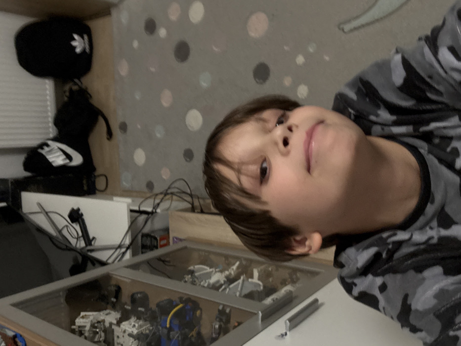 A boy in a gray camouflage sweatshirt leans into the frame. Behind him is a wall with a polka dot pattern. A black Adidas hat and Nike shoe are stacked on a shelf. Below the boy, a glass-covered display case holds various Lego creations, predominantly white, gray, and blue. A gray metallic object rests on the table near the display case. Cables and a Lego box are visible behind the case.