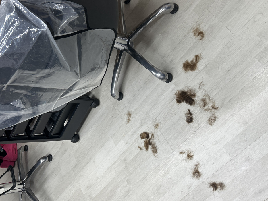 The image displays an interior scene, likely a professional salon or barbershop environment. The primary subject is a significant accumulation of recently cut human hair scattered across a light-colored, wood-grain patterned floor. The hair varies in color, predominantly shades of brown and auburn, appearing in both small clumps and individual strands. In the mid-ground, a black, multi-tiered rolling salon trolley with visible drawers or shelves is positioned. To its right, a salon chair with a black upholstered seat and back is mostly covered by a clear plastic protective cape. This chair features a chrome-plated, five-star base with integrated footrests and wheels. To the left, partially visible in the background, is another chair with a similar chrome-plated base, beneath which a pair of pink athletic shoes or slippers can be seen. No individuals are present in the frame. The scene indicates recent haircutting activity, with the floor awaiting cleanup. The image itself provides no specific details to determine the exact location within the city of Ruse, Bulgaria.