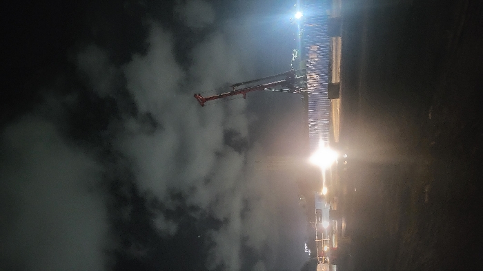 The image captures a night scene featuring heavy clouds and a crane. The crane, with a red arm, is positioned towards the left side. A tall, illuminated structure, resembling a building, stands to the right of the crane. Bright lights emanate from the base of the structure, causing lens flare effects. The overall atmosphere suggests either construction or industrial activity under hazy conditions.