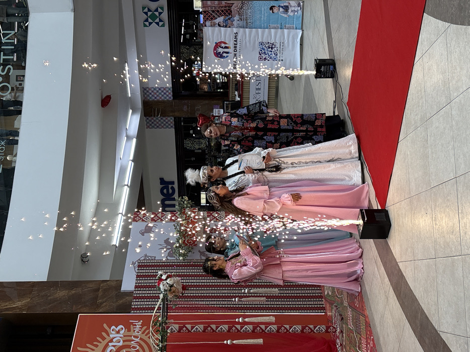 The image depicts an indoor cultural event occurring within a multi-level commercial shopping mall in Petropavl, Kazakhstan. Six women, dressed in elaborate traditional Kazakh garments, are positioned on a tiled floor near a red carpet and a decorative backdrop. In the center, two cold pyrotechnic machines on the floor emit fountains of sparks, illuminating the scene. A woman wearing a white traditional dress with a tall feathered headdress, standing to the right of the left sparkler, holds a white diploma or certificate. Another woman to her left, in a pink dress, also holds a document. A woman on the far right, in a dark patterned coat, stands observing or presenting. The two women on the far left, in pink and light blue dresses respectively, are looking at documents. The background features a red and white striped stage-like setup adorned with a floral arrangement. A large red banner with text in a non-Latin script, likely Kazakh, is visible on the far left. Further right, a patterned backdrop includes stylized animal figures. A white banner with "REACH DREAMS PRESCHOOL," QR codes, and contact information is displayed on the right. Storefronts with "mer" and "O'STIN" signs are visible in the background, beneath an upper mall level where individuals are present. A red heart-shaped balloon floats near the ceiling on the right side. The overall scene suggests an awards ceremony or cultural celebration.