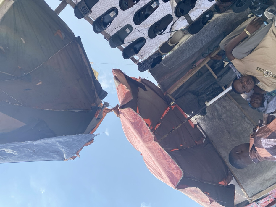 The image presents an outdoor market scene in Satellite Town, Nigeria, under a clear blue sky with sparse white clouds. Two significantly weathered and torn market parasols dominate the upper portion of the frame, providing shade; one dark-colored is positioned higher, and a reddish-brown one is lower and to the left. Below these, a display of multiple pairs of sandals and slippers, predominantly black and light-colored, hangs vertically from a mesh or grid structure, indicating a footwear stall. Three individuals are visible within the lower half of the frame. On the left, a man with short dark hair, wearing a brown and white plaid shirt, is seen from a back-left profile, appearing to stand or lean. To the right, another man, wearing a light tan tunic with a circular gold emblem and light-colored trousers, is seated or reclining, looking directly towards the viewer. He wears a gold-colored wristband on his left wrist. Partially obscured behind the seated man, a third individual with a covered head appears to be resting or sleeping within the shaded area of the stall. The scene depicts a typical commercial environment with makeshift structures and individuals resting or attending to their stalls during daylight hours.