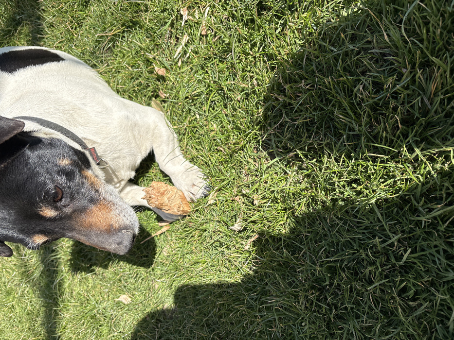 In Hadzhidimitrovo, Bulgaria, a tri-color dog, identifiable as a terrier type with black and tan markings on its head and white and black on its body, is positioned on a patch of green grass under direct sunlight. The dog wears a black collar with a small red tag. It is observed holding a light brown, irregularly shaped organic object, possibly a piece of bark or wood, between its front paws. The dog's gaze is directed towards this object. Distinct shadows are cast on the grass to the dog's left, indicating bright illumination from the right side of the frame, along with a partial shadow extending from the upper left. The immediate environment consists solely of short, vibrant green grass.