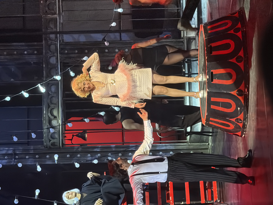 On a theatrical stage, a woman in a blonde wig and white dress with pink trim smiles, positioned on a raised platform. Below, a man in pinstripe pants and suspenders reaches upward. Other figures in black outfits are present. The set includes strings of lights, metal structures, and red accents, conveying a cabaret or burlesque theme.
