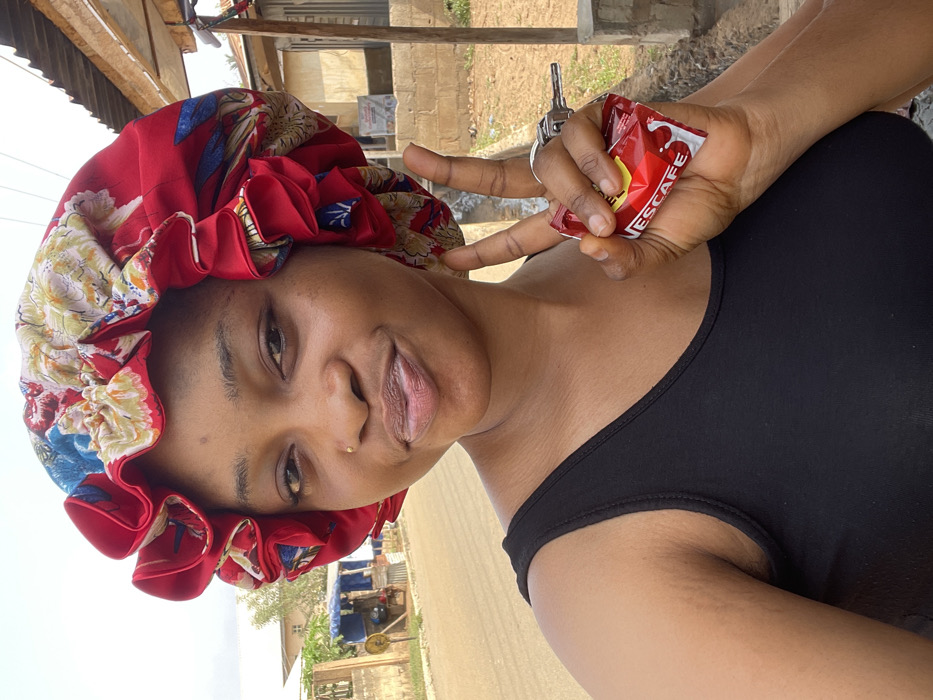 An adult female, wearing a red and multi-patterned satin bonnet and a black sleeveless top, is positioned outdoors on a street in Unknown, Unknown. She has a small gold stud in her left nostril. Her lips are slightly pursed, and her gaze is directed at the camera. Her right hand is raised, with her index and middle fingers extended in a V-shape, while her thumb and ring finger secure a red Nescafe sachet and a set of silver keys on a ring. The immediate background features an unpaved, light brown road surface. To the left, a concrete block wall and a building with a blue tarp roof are visible. To the right, dirt ground, a concrete pillar, and a structure with a corrugated metal roof are present. The sky is bright and appears overcast.