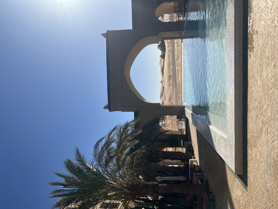 The image displays an outdoor scene at a resort or hotel in Rissani, Morocco, bordering a desert