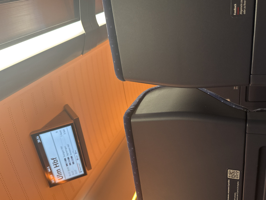 interior of a train carriage. A digital display on the wall reads "Ulm Hbf" and lists upcoming stations and arrival times: "Sigmaringen" at 21:01, "Kempten Hbf" at 21:37, and "Signaringen" at 25:07. The display also shows the time as 20:34. Two dark, padded train seats are in the foreground, one behind the other. A small "Feedback" sticker is visible on the back of the top seat. The interior wall has a soft orange hue.