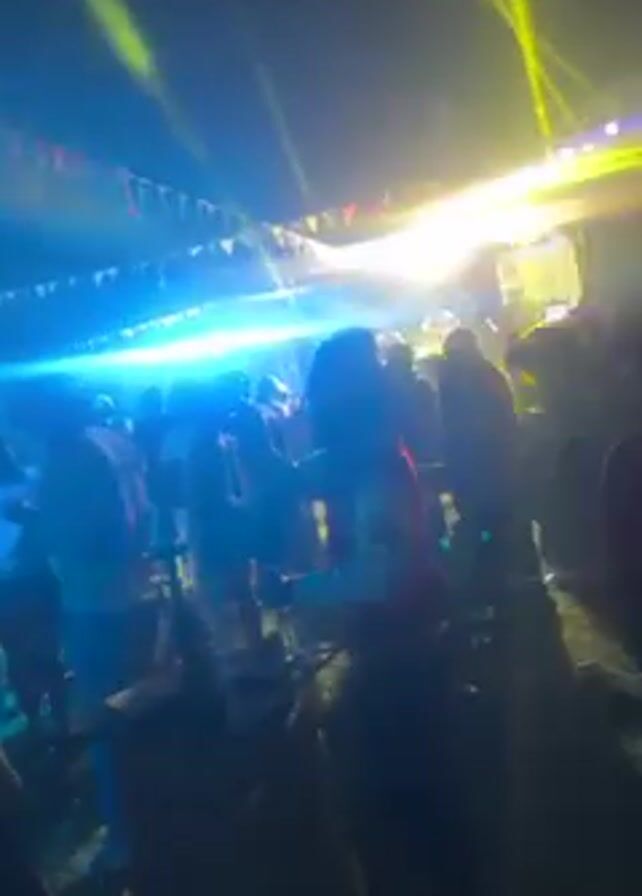 nighttime gathering of people under string lights and colorful stage lights. The crowd is moving, suggesting they might be dancing or enjoying music. Palm trees are visible in the background, illuminated by the light. The scene appears to be an outdoor party or concert.